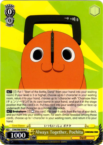 【ACT】 [(1) Put 1 "Start of the Battle, Denji" from your hand into your waiting room] If your level is 3 or higher, choose up to 1 character in your waiting room, return it to your hand, choose up to 1 character with "Chainsaw Man(チェンソーマン)" in its card name in your hand, and put it in the stage position that this card is in. Put this card into your waiting room or face up underneath that character as a marker afterwards. 【ACT】 Brainstorm [(1) 【REST】 this card] Flip over 4 cards from the top of your deck, and put them into your waiting room. For each climax revealed among those cards, choose up to 1 character in your waiting room, and return it to your hand.