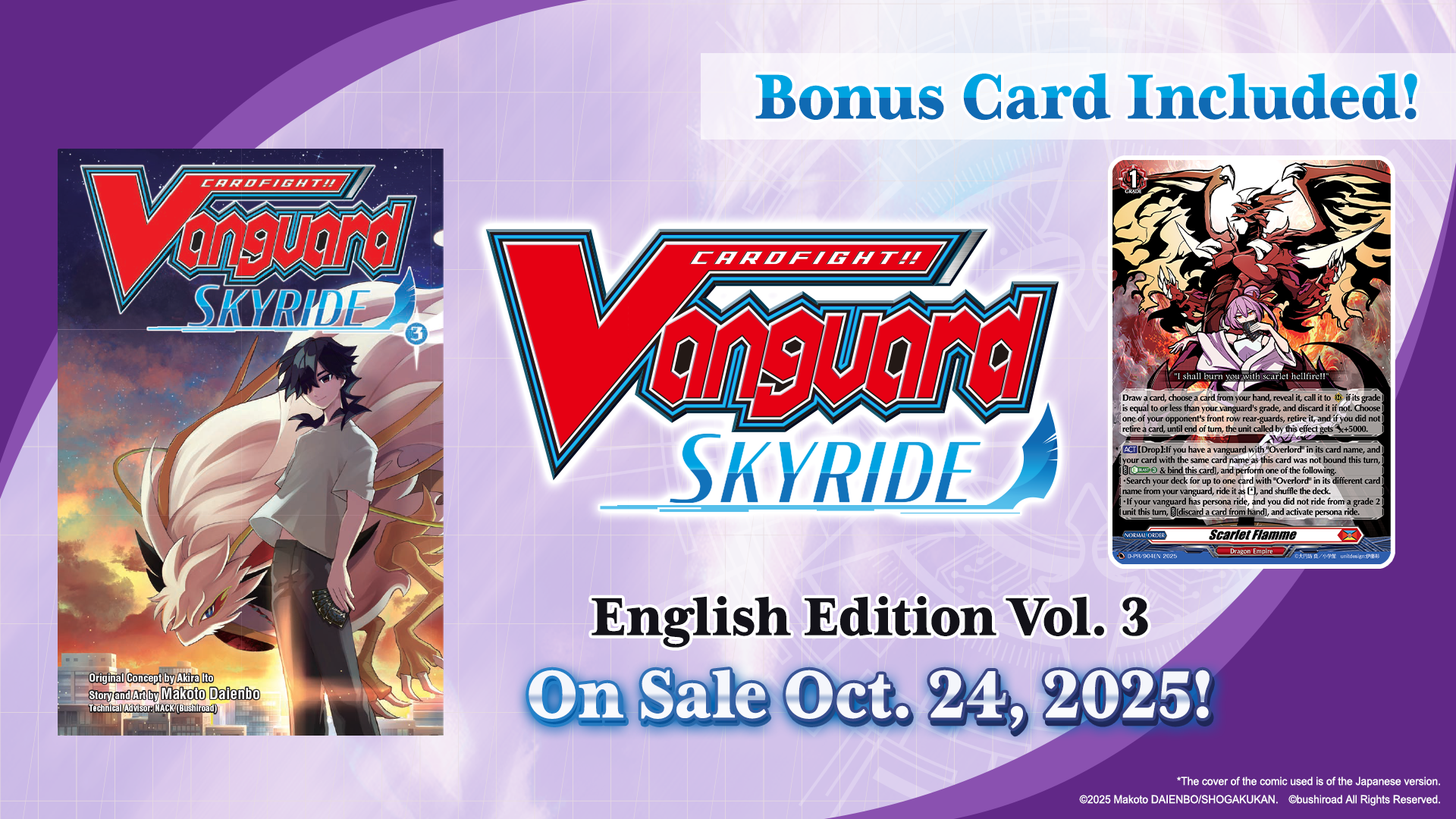 Cardfight!! Vanguard is a multimedia franchise that revolves around the trading card game of the same name, and is supported by complementary works such as the televised Vanguard anime series, and more! Cardfight! Vanguard Skyride is the latest spin-off of the original franchise. Volume 3 comes with a limited-edition Vanguard card: Scarlet Flamme!