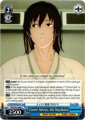 【CONT】 Assist All of your level 3 or higher characters in front of this card get +2000 power.【AUTO】 At the beginning of your clock phase or attack phase, if "Future Devil" is underneath this card as a marker, look at up to 3 cards from the top of your deck, and put them on the top of your deck in the original order.【AUTO】 [Put 1 climax from your hand into your waiting room] When your climax triggers, you may pay the cost. If you do, put the top card of your clock into your waiting room.