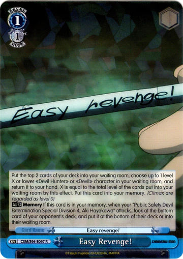 Put the top 2 cards of your deck into your waiting room, choose up to 1 level X or lower 《Devil Hunter》 or 《Devil》 character in your waiting room, and return it to your hand. X is equal to the total level of the cards put into your waiting room by this effect. Put this card into your memory. (Climax are regarded as level 0)【AUTO】 Memory If this card is in your memory, when your "Public Safety Devil Extermination Special Division 4, Aki Hayakawa" attacks, look at the bottom card of your opponent's deck, and put it at the bottom of their deck or into their waiting room.