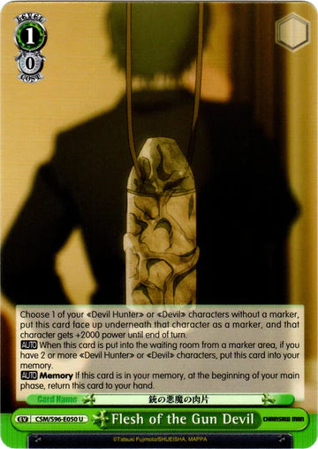 Choose 1 of your 《Devil Hunter》 or 《Devil》 characters without a marker, put this card face up underneath that character as a marker, and that character gets +2000 power until end of turn.【AUTO】 When this card is put into the waiting room from a marker area, if you have 2 or more 《Devil Hunter》 or 《Devil》 characters, put this card into your memory.【AUTO】 Memory If this card is in your memory, at the beginning of your main phase, return this card to your hand.