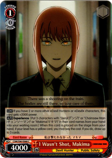 【CONT】 If you have 2 or more other 《Devil Hunter》 or 《Devil》 characters, this card gets +2000 power.【AUTO】 Experience [Put 3 characters with "Denji(デンジ)" or "Chainsaw Man(チェンソーマン)" or "Makima(マキマ)" in their card names from your hand into your waiting room] When this card is placed on the stage from your hand, if your level has a yellow card, you may pay the cost. If you do, draw up to 3 cards.
