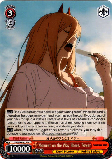 【AUTO】 [Put 3 cards from your hand into your waiting room} When this card is placed on the stage from your hand, you may pay the cost. If you do, search your deck for up to 4 《Devil Hunter》 or 《Devil》 or 《Animal》 characters, reveal them to your opponent, choose 1 card from among them, put it into your stock, put the rest into your hand, and shuffle your deck.【AUTO】 When this card's trigger check reveals a climax, you may deal 1 damage to your opponent. (Damage may be canceled)