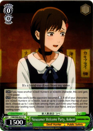 【CONT】 If you have another 《Devil Hunter》 or 《Devil》 character, this card gets +1500 power.【AUTO】 When this card's battle opponent becomes 【REVERSE】, if all of your characters are 《Devil Hunter》 or 《Devil》, look at up to 2 cards from the top of your deck, choose up to 1 card from among them, put it into your hand, put the rest into your waiting room, choose 1 card in your hand, and put it into your waiting room.
