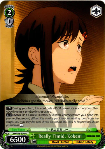 【CONT】 During your turn, this card gets +1500 power for each of your other 《Devil Hunter》 or 《Devil》 characters.【AUTO】 Encore [Put 1 《Devil Hunter》 or 《Devil》 character from your hand into your waiting room] (When this card is put into your waiting room from the stage, you may pay the cost. If you do, return this card to its previous stage position as 【REST】)