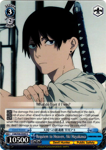 【CONT】 The damage this card deals is resolved from the bottom of the deck.【CONT】 All of your other 《Devil Hunter》 or 《Devil》 characters get +1500 power.【AUTO】 [(1) Put 1 card from your hand into your waiting room] During your turn, when this card's battle opponent becomes 【REVERSE】, you may pay the cost. If you do, deal 1 damage to your opponent. (Damage may be canceled)
