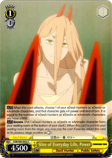 【AUTO】 When this card attacks, choose 1 of your 《Devil Hunter》 or 《Devil》 or 《Animal》 characters, and that character gets +X power until end of turn. X is equal to the number of 《Devil Hunter》 or 《Devil》 or 《Animal》 characters you have ×1000.【AUTO】 Encore [Put 1 《Devil Hunter》 or 《Devil》 or 《Animal》 character from your waiting room at the bottom of your clock] (When this card is put into your waiting room from the stage, you may pay the cost. If you do, return this card to its previous stage position as 【REST】)